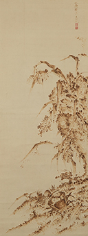 「焼絵(やきえ)」とは、火筆画(かひつが)や焦画(しょうが)、烙画(らくが)などとも呼ばれる、熱した火箸や鏝(こて)を紙や絹などに押し当て、絵画や文字を焦がして表現する技法を用いた作品です。色調は茶から黒に近い色まで展開し、また線描から点描、濃淡といった水墨画の技法も巧みに再現されています。